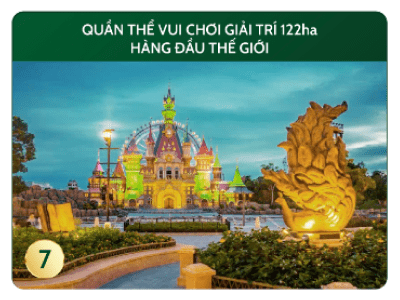 ✦ “Dấu ấn” tiện ích chưa từng có tại Việt Nam: Tháp 108 tầng – Top 10 công trình cao nhất thế giới; Biển hồ nhân tạo lớn nhất thế giới; Nhà hát Sóng Xanh hàng đầu Đông Nam Á; 2 sân golf 18 lỗ; tổ hợp giải trí 122ha (Safari, Viпwoпders,..); bến du thuyền 5 sao; Hệ thống y tế & giáo dục quốc tế.